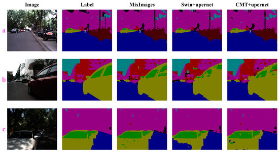 RGB-P quantitative comparison results show that our MixImages was consistently superior to the existing technology. Especially compared to Swin + UperNet, which ranks second in mIoU, MixImages achieved a huge improvement of 3.43% mIoU on the basis of similar parameters. The main performance gains are reflected in “glass”, “pedestrian”, and “bicycle”. It is worth noting that in the qualitative comparison results, the Swin + UperNet, with the worst ability to extract detailed features, has a large number of misjudgments (Figure 5c). In natural urban scenes, the shadows mapped on the car surface generate a lot of RGB noise information. Because of the similar color features and blurred boundaries, more texture detail features are needed to better distinguish them. However, the Swin transformer is a pure transformer visual backbone, so the local neighborhood features of the ground objects were not recognized; the basis for the network to make a judgment seems to be only through the color. MixImages and CMT with transformer and CNN mixed backbones avoid this problem well. On the other hand, we believe that another reason for this phenomenon may be due to the use of a 256 × 256 cropping size. For the semantic segmentation model with a pure transformer as the encoder, the effective receptive field of the network is limited to a local range, and the rest is masked, so it cannot provide a basis for judgment through more long-distance dependencies. Although this phenomenon may be alleviated by using a larger crop size, it at least shows that the lack of a CNN as a complementary pure transformer backbone lacks robustness under extreme conditions, while the backbone with mixed operators learns more steady visual representations.