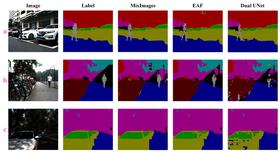 (a–c) show the experimental results under three different samples. The second to fifth columns of the figures show different colors corresponding to different categories: Background (black), Bicycle (brown), Pedestrian (gray), Sky (cyan), Vegetation (magenta), Road (blue), Car (olive green), Glass (green), and Building (red).