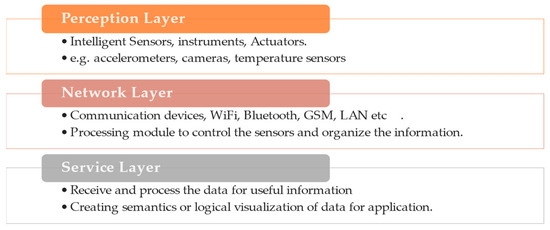 The standard IoT system’s architecture consists of three essential layers, as shown in Figure 1 [22]. The first perception layer is the IoT physical node, which consists of intelligent sensors that gather the required information. The second network layer is the active communication layer, which transforms the physically sensed information into organized and logical information and transmits it. This layer stores and processes the received data, presenting it in more a logical form for the application.