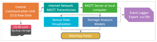 The CU firmware programming employs the MQTT (Message Queuing Telemetry Transport) protocol for cellular network transmission. MQTT is highly suitable for IoT-based and high-latency networks as it offers lightweight, asynchronous data transmission and can retain the messages in the queue [26]. An MQTT-based server is established on a local computer to receive and log the data. The logged data is conveniently accessible through .txt, .csv, or Excel file formats for further processing and analysis. Additionally, the web server publishes real-time plots of the incoming data to monitor the data visually. Meanwhile, the damage analysis algorithms are programmed in Python, which accesses the sensor data from the server and publishes the results on the web portal.