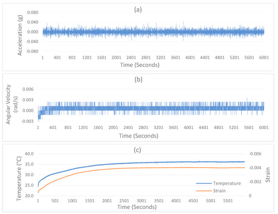 IoT sensing system performance tests under static conditions. (a) Acceleration noise, (b) Angular Velocity/Gyroscope noise, (c) Strain drift under varying temperature.