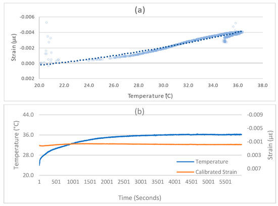 Strain drift and temperature effect compensation. (a) Strain Temperature Calibration Model, (b) Calibrated Strain.