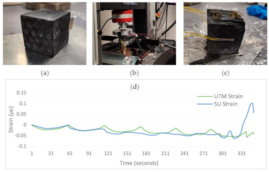 Strain test of the concrete block under cyclic load. (a) Concrete block 50 × 50 mm, (b) Testing with UTM and SU, (c) Cracked block after test, (d) Comparision of Strain in Concrete block under cyclic loading.
