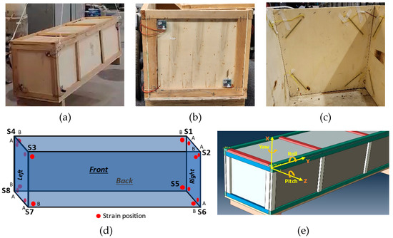 Considering time and cost effectiveness, a small wooden frame-based structure was built to be used as a module. The design of the wooden module was ensured to resemble the actual MiC module structure. The structural frame of this module was built using timber bars having a cross-section of 16 × 36 mm, ensuring reasonable structural strength for the module. The overall dimensions of this module were around 1600 × 500 × 500 mm, having a total weight of around 80 lbs., as shown in Figure 7a,b. The module walls were built using thin balsa plywood with a thickness of 4 mm, whereas the bottom base floor was 16 mm thick. Two timber base supports with a cross-section of 50 × 90 mm were also affixed at the bottom. The properties of the materials used are given in Table 2.