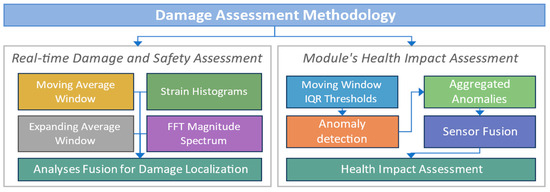 This study presents various analyses to demonstrate how the sensor-measured response can be used to identify and estimate the damage in the module. These analyses analyze the real-time response of different sensors and evaluate the variations to detect any structural variation, deformation, or damage. The damage assessment strategy has two phases, as shown in Figure 8. In Phase 1, the damage and safety assessment analyses utilizing the real-time sensors’ responses are presented. Different individual analyses are performed for each sensor type to identify the structural variations sensed by it. First, moving average and expanding average windows analyses are performed for strain sensors to determine the damage from the real-time sensors’ response. Then, the strain field histograms and the Fast Fourier Transform (FFT) spectrum magnitudes for the accelerometer and gyro are calculated. Finally, the results of all individual analyses will be compared and fused to confirm and validate the identified damage and assess its location.