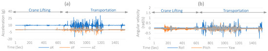 During the field experiment, the IoT system provided a real-time response from all the sensors installed on the module. The real-time sensor response is plotted to analyze the events of logistic operations. The variations in the sensors’ response help estimate the nature of the operation and any significant anomaly in that operation. The acceleration and gyro time series plots, shown in Figure 9, indicate various module movements during crane lifting and transportation operations. The crane lifting operation (between 0–600 s) was slow and smooth; thus, low acceleration variations were observed compared to transportation.