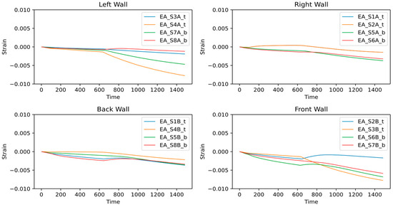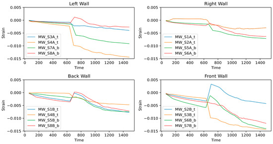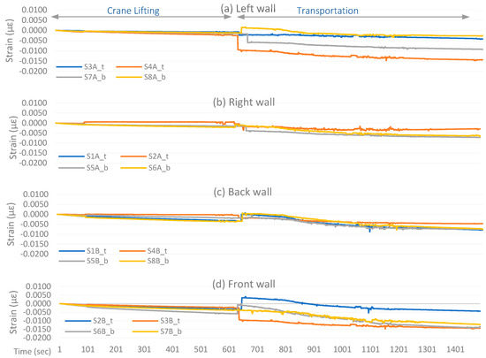 It can be seen in the moving average window plot, shown in Figure 11, that a significant strain change starts during transportation operations. For the right and back walls, the strain change remains less than −0.008 µε for all the sensors. On the other hand, the left and front walls experienced significant strain changes for most of the sensors attached. The sensors S2B_t show high strain displacement at the beginning of the transportation operation but later return to the average strain trend. The S7A_b sensor shows moderate strain displacement reaching −0.01 µε. The sensors S7B_b, S4A_t, S3B_t, and S6B_b show the most critical response, where strain displacement keeps propagating and reaches up to 0.014 µε.