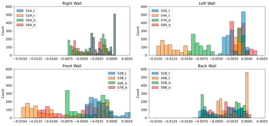 The strain field histogram (SFH) helps to compare the frequencies of the discrete strain response values measured over time. Peak strain frequency indicates the amplitudes of various strain measurements, highlighting the variation in the measured response of several installed sensors [33]. Such variations may indicate changes in structural conditions near those sensors [30,34,35]. The SFH plots shown in Figure 13 suggest that the strains’ range or spread is higher in the sensors installed on the left and front walls, reaching up to −0.0150 µε. The sensors installed on the right and back walls measured the maximum strain displacement of around −0.0075 µε. The sensors S4A_t and S7A_b on the left wall and S3B_t and S7b_t on the front wall notably measured an abnormal response compared to other sensors. Also, unlike other sensors, the sensor S2B_t measured abnormal strain values up to 0.0025 µε. The identified discrepancies in the sensor response led to estimating and locating the damage on the module walls.
