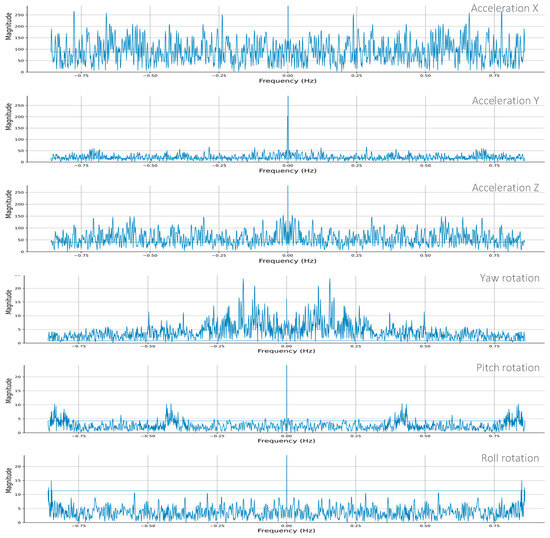 A Fast Fourier Transformation (FFT) analysis is conducted to evaluate the acceleration and gyro sensors’ response. The FFT magnitude provides the relative strength of various frequency components measured by each sensor. In the FFT spectrum, a distinguished higher magnitude frequency component called the dominant frequency represents the essential characteristics of the logistic operations [36]. In other words, the dominant frequencies indicate the primary structural response under the operations. Thus, if the dominant frequencies of sensors installed at various locations show any variation, it would suggest a change in the structural conditions at that point, i.e., structural damage [32,37].