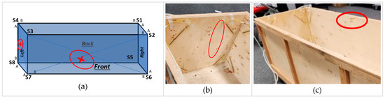 On the left wall, the S4A_t sensor sensed a high response variation, indicating significant damage on this wall. Similarly, the sensors S7 and S7A_b, installed on the bottom right corner of this wall, also sensed moderate response variations. S8 sensed low variations at the bottom left corner of this wall. Now, triangulating the relative impact sensed by each of these sensors, the approximate location of the damage is predicted, as illustrated in Table 4. The back and right walls did not experience any significant damage. Only FFT analysis highlighted sensors S5 and S8 attached on the corners of the back and right walls. However, variations in these sensors are confirmed to be related to the front and left walls. The above-identified damage on the module walls can also be realized in the actual module, as shown in Figure 15. Due to the wooden material of the module, they are hard to see visually. The damage and location predicted on the left wall are similar to the actual damage in the module. However, the predicted location of damage to the front wall is lower than the actual location. This assessment variation is possibly due to the module’s loosely fixed top roof plane during the experiment, which interrupted the response of the sensors installed at the top corners.