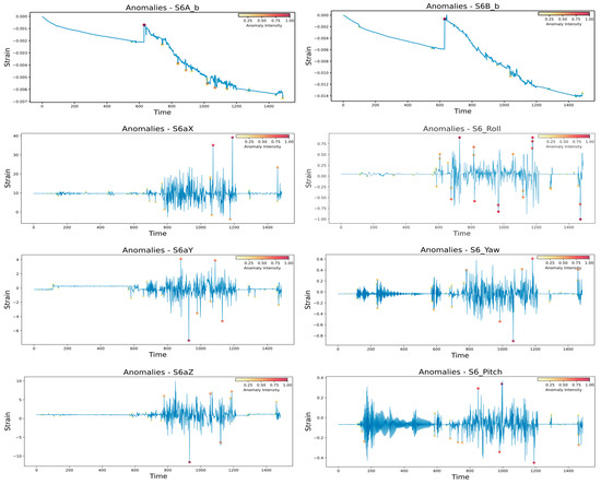 Besides any critical cracks or damage in the module structure, some hidden, intrinsic underlying minor latent damage could remain undetectable. Such minor damage is induced in the structure due to rigorous MiC logistic operations and can further propagate into critical damage during the building use phase. Therefore, it is essential to assess the overall impact of logistic operations on the health of the module structure. Such an assessment can help devise a proactive maintenance schedule for the module and improve the module’s useful life. The adopted approach exploits the typical anomaly detection approach, as all the abnormal logistic impacts are accumulated to calculate the relative impact over different module parts. For anomaly detection, any sensor response in a moving window exceeding the defined threshold is identified as an anomaly [32,40]. Considering a 30-s moving window and one SD (standard deviation) as a threshold, all the anomalies sensed by each sensor were detected. A programmed model detected all the anomalies in real time during the logistic operations, as shown in Figure 16.