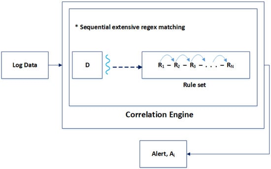 Figure 1 illustrates how a traditional correlation engine, i.e., SEC works, where log data “D” are input into the correlation engine. The data “D” are sequentially matched against each rule “” of the rule set. This process is tedious and time-consuming, generating an alert “” whenever a match occurs. If the input log data “D” are large or the rule set contains numerous rules, more time will be required to complete this process, making this phase slow and impacting the performance of the correlation engine.