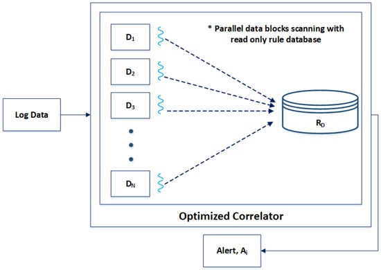 Figure 2 shows the design of our proposed correlation engine, i.e., the OC. Our proposed correlation engine simultaneously processes multiple pattern matches, significantly speeding up the correlation process. In the proposed OC, when log data are input into the correlation engine, the log data are split into multiple data blocks “Di”. Each data block “Di” is picked up by a thread and is matched against the rules database “RD”. As much as the total number of threads supported by the system architecture can be created by the OC. The rules database “RD” is a read-only database, allowing for simultaneous access by multiple threads. This parallel processing of log data blocks is made possible through the “Hyperscan” library.