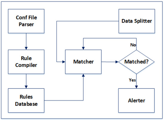 In the above algorithm, “D” represents the log data input into the OC, “R” represents the rule set of correlation rules, and “PD” represents the pattern database generated from the rule set. After initialization and creation of the pattern database, the input log data are converted into blocks, i.e., “Di”. Each log data block “Di” is matched against the pattern database “PD”, and if a match occurs an alert is generated, i.e., “Ai”. At its core, Hyperscan utilizes two techniques [55,56], which are described below: