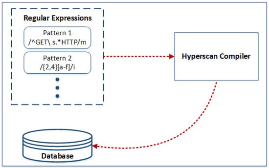 The Hyperscan library used in our proposed OC is an efficient and powerful platform for many regex pattern-matching applications, e.g., IDS/IPS [54]. The Hyperscan library, being open-source, allows for the simultaneous matching of a large number of regular expressions. Hyperscan provides a C application program interface (API) for various applications. The parallelism of the Hyperscan library makes the applications very fast. The Hyperscan library is a regular expression matching library that offers high performance, making it suitable for various security applications like firewalls, IDSs, IPSs, deep packet inspection (DPI) applications, etc. Algorithm 1 represents the working principle of the OC during its execution.