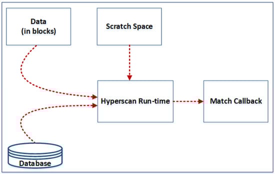 The Hyperscan runtime is shown in Figure 5 and has been developed in C++. The Hyperscan runtime requires a memory area called scratch space for its intermediate operations. This scratch space stores temporary information during the scanning process. The compiled pattern database is used to match the incoming data, which is divided into blocks. The internal Hyperscan matching engine uses deterministic finite automata (DFA) and non-deterministic finite automata (NFA) together with the Intel processor’s single instruction multiple data (SIMD) instructions to speed up the matching process. The user application receives the result of the matches via the callback function it provides. An important point here is that the compiled pattern database is read-only, which means that multiple CPU cores or threads can access this database simultaneously to increase the throughput of the matching process.