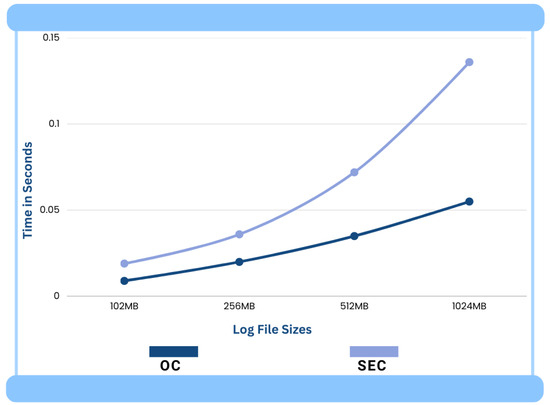 The SIEM system includes our proposed OC and SEC applications. Once we have collected a reasonable amount of data, we apply SEC and the proposed OC to the collected log files of different sizes. The main difference between these two correlation engines is that SEC uses the standard pattern-matching mechanism of Perl, while our proposed OC uses Hyperscan for pattern matching. The simulation results are compared based on real-time response and system time/execution time. Real-time response is the time an application starts its execution and lasts until its completion. The system time/execution time is the time it takes for an application to be executed by the CPU. SEC and OC are executed on a virtual machine. The details of the system and the virtual machine on which SEC and OC are executed are listed in Table 3.