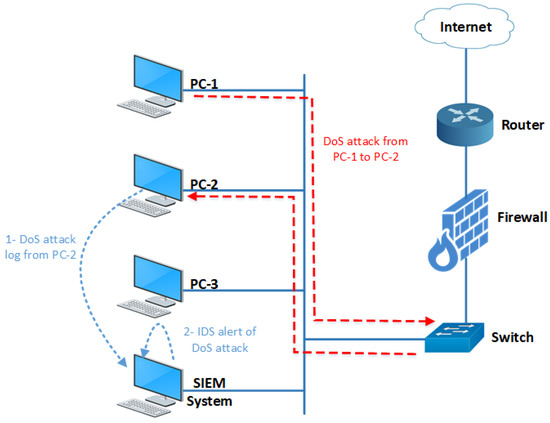 In this scenario, a DoS attack is launched from the PC-1 machine to the PC-2 machine, with both computers connected via the same switch. This configuration results in the generation of DoS attack logs on two source devices.