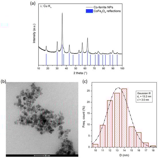 Structural and morphological properties of Co-ferrite NPs: (a) XRD pattern, together with the reference lines of CoFe2O4; (b) representative TEM image; (c) NP size distribution obtained by the statistical analysis of TEM images and fitted by a Gaussian function (dashed line).