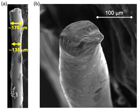 The morphology of the Fe-based wire is investigated by the SEM images shown in Figure 3. The top-view image (panel a) reveals that the diameter of the wire is not perfectly constant but is characterized by fluctuations of a few tens of microns around an average value of 150 μm. Furthermore, the cross-sectional image (panel b) shows a homogeneous morphology of the wire throughout its thickness with no visible cracks, crystals, or inclusions.