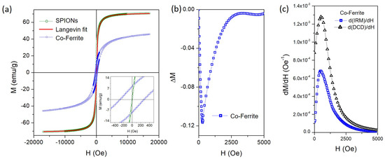Room-temperature hysteresis loops for SPIONs and Co-NP samples in dry powder form are reported in Figure 4a.