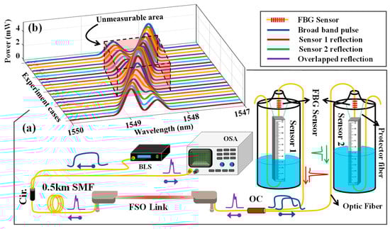 In this paper, we focus on two sensors to investigate the crosstalk and sensor interference in the system. Figure 2a depicts the experimental setup to measure water levels with two CP-900 water level sensors manufactured by Citpo Technologies Inc. (Taipei, Taiwan), in which the two sensors have identical operating wavelengths. The BLS emits a broadband pulse to the optical circulator, preventing any interaction between the emitted and reflected light. The broadband light then transmits through the FSO channel to the 70:30 optical coupler and the sensors. In the experiment, a light source was used to cover the typical range of FBG band operation, which typically is 1528–1568 nm. The extinction ratios for the FBG sensors are 5.25 dB and 3.1 dB, respectively, with a central wavelength of 1548 nm and a standard single-mode fiber utilized. The FSO link utilized in the experimental setup spanned a distance of 2 m in controlled laboratory conditions, maintained at a room temperature of 26 °C, however, it is possible to transfer over a 1 km distance [30].