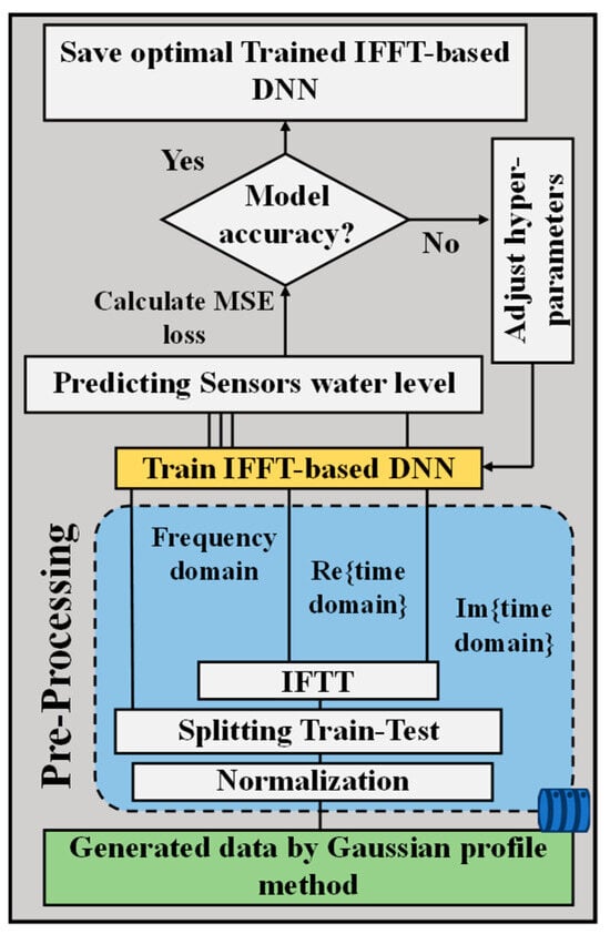 where Ipeak,i is the peak reflectivity in the ith row and ΔλFWHM is the full width at half the maximum intensity of the FBG sensor. The λBi,j is the center wavelength of FBGi,j that depends on its water level. The n is the number of rows, k is the number of sensors in each row, and we consider N(λ) as a random white Gaussian noise in the system. This method then serves as the initial step of the IFFT-DNN model to produce the required dataset, as depicted in Figure 3. Subsequently, as illustrated in the flow of each state in Figure 3, the generated dataset is normalized, and then an IFFT is applied to each data point.