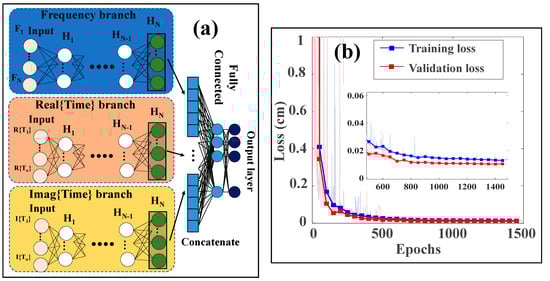 These three inputs enter the hybrid neural network and traverse multiple hidden layers before reaching the output layer. The hidden layers process various aspects of the input data, including the frequency domain and the real and imaginary parts of the time domain. It is also worth mentioning that dropout and L2 regularization [35,36] are also applied in each branch to prevent overfitting. After processing, the outputs from each branch are concatenated into a unified vector and pass through a fully connected layer to predict the water level. The Mean Squared Error (MSE) is used as the loss function and as the criterion for model accuracy. After training the network, if the desired accuracy is not achieved, the hyperparameters are tuned to improve performance. Once the model reaches its highest accuracy, it is saved and used to predict water levels for the experimental data. As shown in Figure 4b, the network achieves a MSE of less than 0.02 cm for training and validation. Details of the IFFT-DNN network and optimizer settings are provided in Table 1.