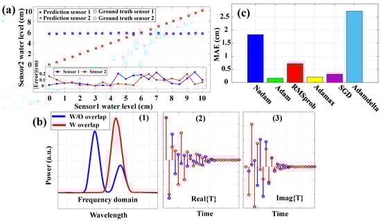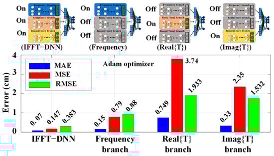 In Figure 5b, the three inputs for each branch of the IFFT-DNN model under both overlapping and non-overlapping conditions are depicted. As it can be observed the differences between these conditions in the time domain help the network’s ability to achieve a higher accuracy. A comprehensive analysis to select the optimal optimizer is conducted, with the results illustrated in Figure 5c. The MAE of the experimental results is plotted for various optimizers used in training the IFFT-DNN model. The Adam optimizer demonstrated the best performance, yielding the lowest MAE, followed by RMSprop, Adamax, Nadam, SGD, and Adadelta. Therefore, the choice of optimizer has a substantial impact on both the training efficiency and final prediction accuracy, with Adam emerging as the most effective for this task. It is worth mentioning that both the total error and each case error become much lower than the previous study [37]. In the previous study, a DNN network utilizing only the frequency domain was employed to analyze the sensing system. In contrast, the current manuscript introduces a dual-domain approach, uniquely combining both a frequency and time domain analysis. This dual-domain method has not been extensively investigated in other sensing system research, making this approach novel and innovative.
