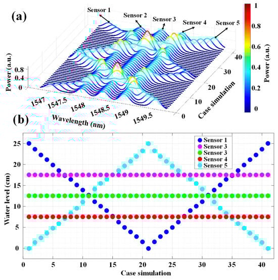 A highly multiplexable method for creating an array of active fiber sensors has been proposed in [17] as well as the process for creating easily multiplexable active fiber sensors. High-temperature stable Type-II fiber sensor arrays are produced in conventional telecom fibers using the femtosecond laser direct writing technique. In the demonstration, six Type-II FBG sensors were used in an active fiber sensor array. These six FBG sensors can be optically heated, enabling both passive and active measurements with a 225 mW in-fiber power. In [18], a dense wavelength division multiplexing (DWDM)-based passive optical fiber sensor network has been demonstrated to remotely monitor the spent fuel pool’s water level in nuclear power facilities. An arrayed waveguide grating (AWG) for DWDM has been employed, and the water level was measured in real time by analyzing the optical signal spectrum relayed from the sensing units. However, this method used several sensors for only measuring a single spot which leads to increased cost when needed to measure multiple spots. A FBG temperature sensor array as a framework for a liquid level measuring and classification system has been explored in [19]. The fluids were divided into two categories for the oil classification: oil and non-oil, or water and emulsion. The random forest (RF) technique was selected for the classification due to the low variability of the classes. In [20], the authors also interrogated several FBG temperature sensors, and several machine learning methods were used to predict the water levels by using nine FBG sensors. However, the prediction error is still more than 7 cm in some cases and more than 3 cm on average.