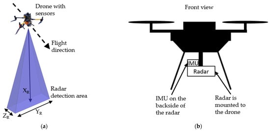 (a) Field of view of the radar sensor mounted on a drone including axis description from the radar. (b) Radar sensor and IMU mounted on the drone.