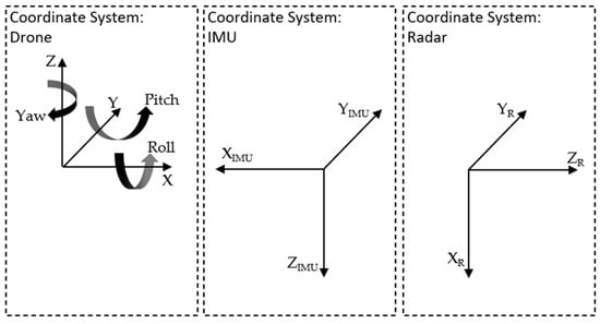 If the radar is installed as shown in Figure 1a, the coordinate system of the radar is different from the drone and the IMU coordinate system shown in Figure 2.
