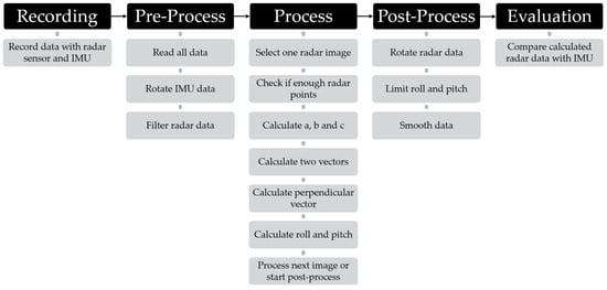 In this research, a methodological approach for calculating the flight attitude of a remote sensing system from radar sensor data was presented. The process to calculate the angles is organized in five main steps with various sub-steps. This process can be run automatically and only needs adjustment if the mounting of the sensors is changed. The calculated roll and pitch angles correlated with the angles from the IMU sensor for all three evaluated recordings.