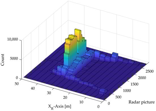 The calculation process is designed to determine the attitude by analyzing the radar data, focusing on identifying the ground plane and filtering out irrelevant data points. As such, the ground plane has the most reflections in the radar data, which can be visualized with a three-dimensional histogram. Figure 4 shows the first recording with all radar images and the distance XR to the ground, as well as the count of how often this distance occurs. It shows that most counts are in the 30 m to 33 m bars, which correspond to the original flight altitude of 30 m. At the beginning and end of the histogram, the distance decreases due to the take-off and landing of the drone.