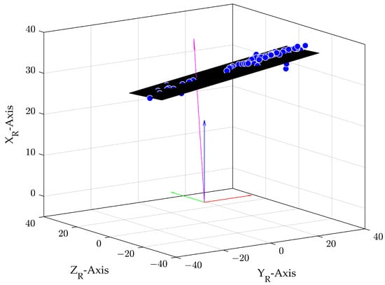 Figure 5 shows the radar detection points as blue points. With the described calculation process, the black plane as well as the perpendicular vector in magenta can be determined. For a better understanding, the normal cartesian coordinate system vectors in red, blue and green are shown.