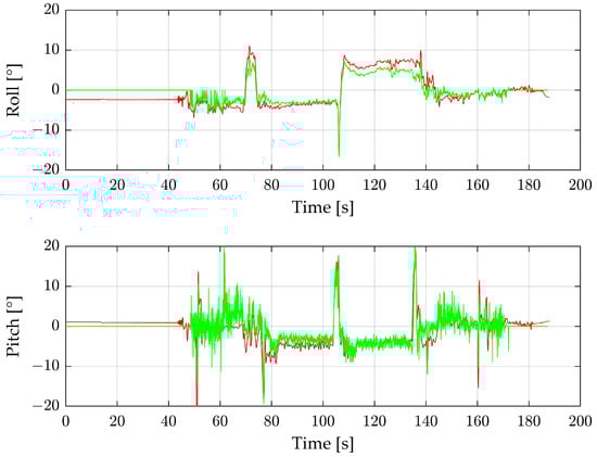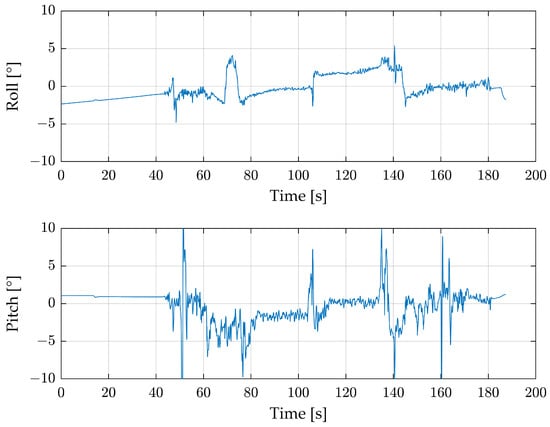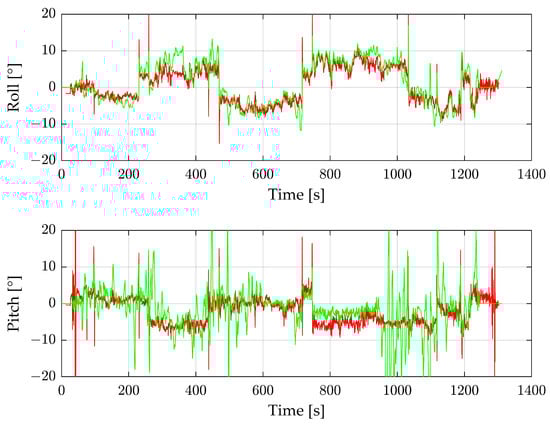 The take-off procedure at 50–65 s improves the roll angle. This shows that the median filtered radar data point is not at 0°, as would be expected based on Figure 6, but between −3° and −5°. The main flight parts do not improve significantly with the filter. The pitch angle improves throughout the flight, not only during the noisy take-off part but also during the main flight.