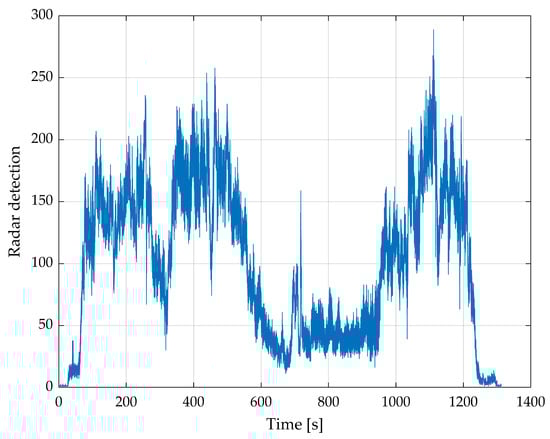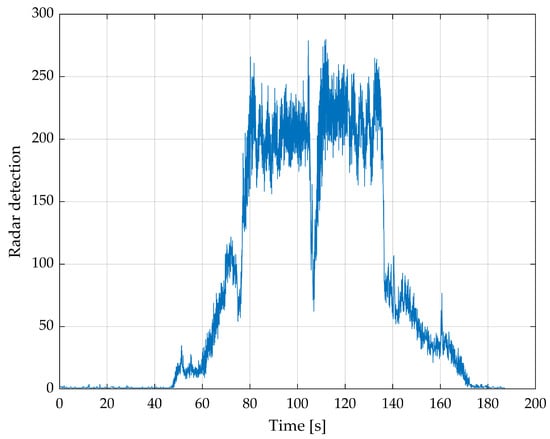 Figure 7 shows the number of radar detections per radar image. In combination with Figure 6, it can be assumed that a minimum of about 50 radar detections per radar image is sufficient for good and stable angles, whereby the roll angle is stable earlier than the pitch angle.