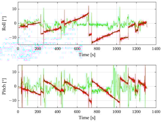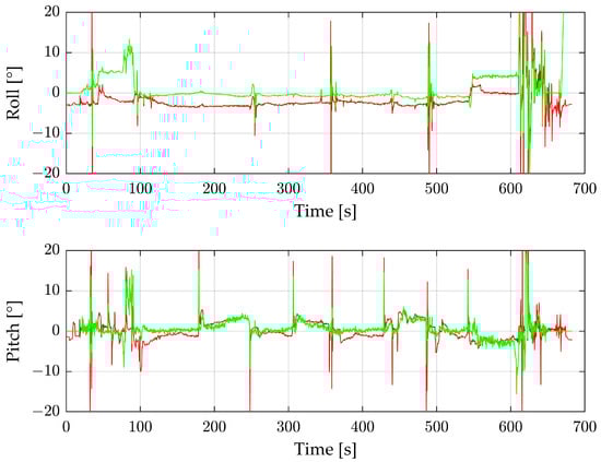 For the second flight, the same setup and configuration are used as for the first flight. Figure 11 shows the reconstructed, moving-median filtered angles of the radar sensor in green, and the IMU values are shown in red.