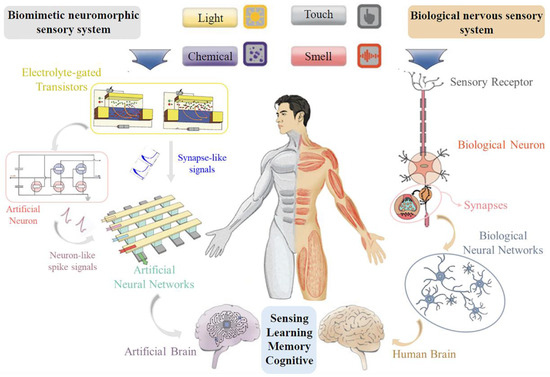 Schematic diagram of the integral architecture of the biomimetic neuromorphic sensory system and the biological nervous sensory system, depicting, on the left, the pathway from sensing to the neurological signal acquisition element to the implementation of the artificial brain, and on the right, the signaling process in a living organism [76,77].