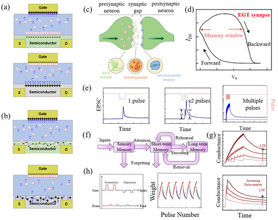 Working mechanisms of the operation of (a) EDL transistors and (b) ECTs at different gate voltages [75]. (c) Schematic diagram of a neurotransmitter-mediated chemical synapse between biological neurons. (d,e) Schematic illustration of typical synaptic transistor characteristics [46,92]. (Pink lines represents the pre-synaptic stimulis, and blue plot indecates the EPSC) (f) Three major stages of memory and forgetting in the human brain, as described by the Atkinson–Shiffrin memory model [93]. (g) Transformation from STP to LTP by stimulation with different frequencies and pulses [94]. (h) Artificial synaptic learning and forgetting processes [95]. (Red dots indicate increasing synaptic weights during potentiation corresponding to the left panel, and blue dots shows decreasing synaptic weights during depression).