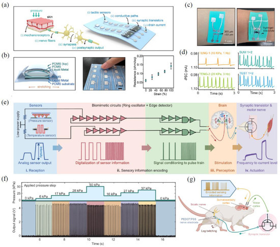 Tactile perception system based on EGTs. (a) Biological and neuromorphic mechanisms for tactile sensing systems, with (b) TENG for mechanosensory and power supply functions. (c,d) Optical image of the integrated tactile system showing two TENG inputs and their synaptic signals [134]. (e) Schematic diagram of the overall process for implementing an artificial sensory (tactile and temperature) motion loop, combining a ring oscillator and an edge detection module. (f,g) Structural diagram of the artificial sensorimotor system and pulse train output under five variable stages, according to the pressure sensor [135].