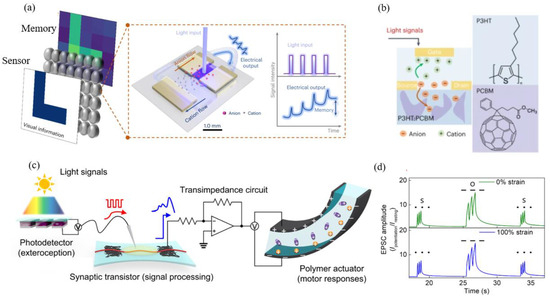 Beyond developing bio-electronic devices or humanoid robots with advanced tactile neuromorphic system functions for the future, exploring light-responsive, optically gated synaptic transistors (organic photonic synapses) offers opportunities to simulate the image preprocessing and recognition functions of the human retina [136,137,138,139]. To date, FETs have been among the primary platforms for organic photonic synapses [140,141]. However, due to the charge shielding effect at the channel–dielectric interface, FETs still face intrinsic obstacles in achieving linear multilevel conductance states, which hinders their application in neuromorphic computing [140]. Therefore, Chen et al. [142] have proposed an artificial retina consisting of an array of optoelectronic synaptic devices, each of which has the combined functions of light perception, optoelectronic signal transduction, and memory (Figure 5a) The formation of memory in the human brain relies on ion-flux-driven synaptic transistor activity. As a result, the artificial retina is capable of efficiently sensing, remembering, and recognizing image information. More notably, to simulate this ion-flux-modulated synaptic activity and construct light-regulated photoelectrical synapses, the building blocks of the artificial retina incorporated a conventional photoactive layer (poly(3-hexylthiophene) (P3HT) and [6,6]-phenyl-C61-butyric acid methyl ester (PCBM)) into the transistor channel. In this context, light absorption can interfere with electrochemical doping, as light-induced charge carriers in bulk heterojunctions facilitate charge compensation through ion transport from the electrolyte to the channel. Consequently, light can serve as a presynaptic input to generate a postsynaptic electrical signal (Figure 5b). While organic optoelectronic artificial synapses present a feasible approach for developing vision-inspired neuro-electronics by emulating biological synaptic functions, research in the domain of electrochemical transistors has been sparse, predominantly focusing on material exploration and the development of individual devices to mimic vision-related synaptic responses and memory characteristics [143,144]. In an attempt to achieve a more integrated visual neuromorphic system, Lee et al. [145] proposed an organic optoelectronic sensing motor system based on the optogenetic principle. This system uses organic photoelectronic synapses and a neuromuscular system based on stretchable organic nanowire synaptic transistors (s-ONWSTs) (Figure 5c). Voltage pulses from a self-powered photodetector triggered by an optical signal drive the s-ONWST, and the resulting informative synaptic output can be used not only for optical wireless communication in human–machine interfaces, but also for the optically interacting actuation of artificial muscle actuators, in the same way as biological muscle contractions. Furthermore, the visual neuromorphic system is also soft and maintains output stability, even when stretched (Figure 5d). As electrolyte-gated transistor technology advances, vision neuromorphic systems are expected to play a crucial role in various fields, leading to smarter, more efficient, and more adaptive systems capable of performing complex visual tasks in real-world scenarios.