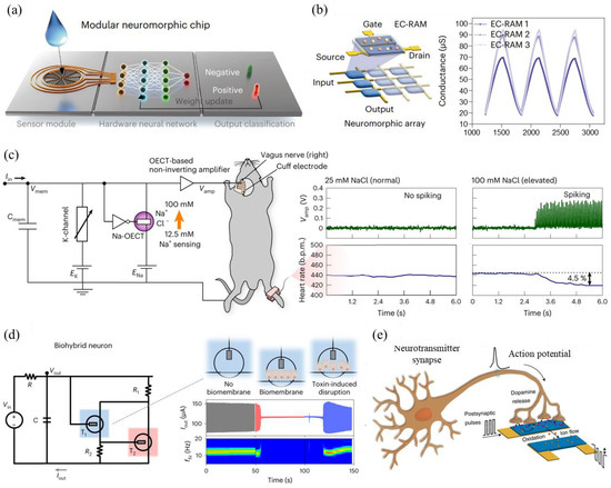 Neurons could signal through membrane potential peaks that are determined by ion channel voltages, as well as ion- and neurotransmitter-dependent conductance across the cell membrane. Potassium ions, sodium ions, and other ions pass through ion channels on the surface of the cell membrane to change the membrane voltage, thereby generating an action potential [122,123]. Therefore, the simulation of ions in and out of ion channels by electrolyte-gated transistors is an important component in the realization of a bionic neuromorphic system. However, leaky integrate-and-fire model neurons based on inorganic semiconductors do not include complex ion channel dynamics and can only simulate a limited number of neural features [127,128]. OECTs based on ion–electron hybrid conducting polymers are attractive in this regard due to their biocompatibility, biologically compatible switching speeds, low operating voltages, and ion–electron coupled transport properties that can be modulated by external ions or molecules. Van de Burgt et al. [146] prepared ion-selective organic electrochemical transistors (IS-OECTs) using modified treated PEDOT:PSS to monitor physiological levels of potassium and chloride ions without the use of ion-selective membranes and constructed modular neuromorphic biosensors based on this IS-OECT (Figure 6a). The IS-OECT serves as an electrochemical stochastic memory, where differences in conductance values due to changes in ion concentration are used as synaptic weights. It is trained by a hardware-based neural network that uses error-signaling feedback to modulate the conductance of an organic neuromorphic device, enabling accurate disease classification (Figure 6b). Simone et al. [132] demonstrated a BBL-based ion-tunable anti-ambipolarity to mimic the activation and inactivation of sodium channels in biological neurons, leading to conductance-based organic electrochemical neurons (c-OECN). By connecting the c-OECN to the vagus nerve, Na-OECT can detect the Na+ concentration, produce spikes of intensity corresponding to it, and electrically activate the vagus nerve, which causes changes in the heart rates of mice (Figure 6c). This demonstrates that it is possible to respond to specific concentrations of biochemical signals via c-OECN, leading to event-based sensing, biointegration, and neural activation functions. Paschalis and colleagues [72] report an organic artificial spiking neuron consisting of only two OECTs (T1: depletion transistor and T2: enhancement transistor) that modulates neuronal excitability and triggers spiking by altering ,in situ, the concentration of biomaterials (e.g., ions or dopamine) in the fluid [73]. An epithelial cell membrane was also incorporated between the T1 gate and the channel to create a biomixed interface that modulates the spiking properties of the artificial neuron in real time through the cell membrane barrier. Thus, this organic artificial spiking neuron is capable of local and in situ neuromorphic sensing and biological interfaces (Figure 6d). Francesca et al. [147] constructed a neuromorphic device that realizes the basic functions of biological neurons through a neurotransmitter-mediated neuromorphic device (Figure 6e). The authors used PC-12 cells as dopamine synaptic precursors and an organic neuromorphic device as a postsynaptic body, which combined to form functional biohybrid synapses. The dopamine released by PC-12 cells can be locally oxidized at postsynaptic terminals by gate electrodes, leading to changes in the conductivity of active layer channels at postsynaptic terminals, thus producing transient, short-term, and long-term enhancement analogous to that in biological neural networks.