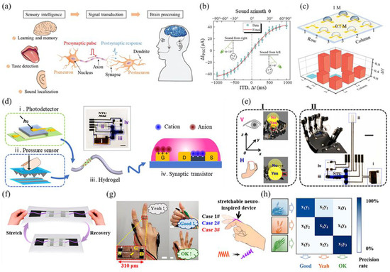 (a) Signal processing in biosensory systems, in which presynaptic impulses from a preneuron are transmitted through the axon to the synapse to elicit a postsynaptic response in response to an external stimulus. (b) The direction of the sound is determined by calculating the difference between the currents of the two post-neurons (ΔIPSC) as a function of time. (c) Detection of 0.1 M and 1 M acetic acid and generation of taste mappings in a 3 × 3 array artificial tongue arrangement scheme [148]. (d) BASE patches for visual and tactile fusion. Subfigures (i) to (iv) show the photodetector, pressure sensor, hydrogel (stained with 0.04% methylene blue), and synaptic transistor, respectively. The scale bar is 5 mm. (e) Visual–haptic fusion motion control. Subfigure (I): “Yes” and “No” positions inferred from visual (top, pink) or haptic (bottom, blue) feedback. The position is labeled as “yes” if the robot’s hand can hold the ball based on one type of sensory feedback, and “no” otherwise. Subfigure (II): Enlarged image of the modified BASE patch and the BASE patch on the robot. The scale line is 5 mm [149]. (f) Schematic of NISNT after repeated stretching and recovery. (g) Photographs of NISNT attached to the knuckle in three gestures, and schematic diagrams of the joint in three different degrees of finger bending (case #1, straight; case #2, 30°; and case #3, 45°), The scale bar is 1 cm. (h) The confusion matrix for three different gesture categorization tests with different exposure times and numbers of iterations [150].