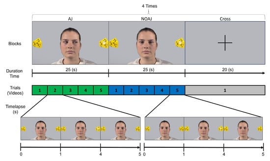 - Joint Attention (AJ): The interlocutor initially gazed straight ahead, then oriented their gaze towards one of two surrounding objects (cheese slices) where a mouse appeared. Each video sequence was repeated for a total of 25 s per block. In each video, the interlocutor (an actress) initially fixed their gaze straight ahead, then performed an eye movement towards one of the two surrounding objects (eye movement starting at 1 s), randomly (equal number of trials to the right and left throughout the experiment). A mouse appeared at the cheese slice the interlocutor fixated on. At the end of the video, the interlocutor redirected their gaze straight ahead (returning their gaze at 4 s of the video).