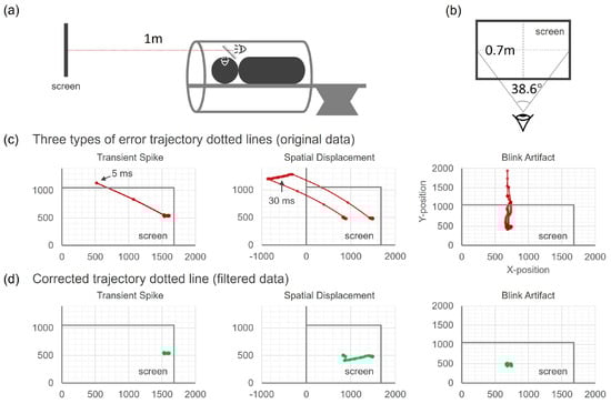 - Spatial displacement: A short-term displacement of the recorded eye movement data to an incorrect position with the sensor continuing to record the incorrect position for a period. However, the relative displacement is accurate before returning to the correct position, generally lasting from several tens to a few hundred milliseconds.