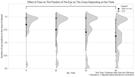 - Temporal analysis of task performance: To assess the effect of time on task performance, we calculated the mean number of task-specific gaze positions for each trial of each condition for every participant. These trial-wise means were then used to perform a non-parametric Friedman test on the filtered data to determine if there were significant temporal effects on task performance. This step allowed us to evaluate whether participants’ adherence to task instructions remained consistent over time.