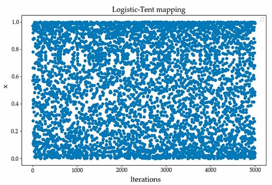 where a(0, 4) is a constant. Figure 2 illustrates the distribution of the Logistic–Tent mapping initialization after 5000 iterations.