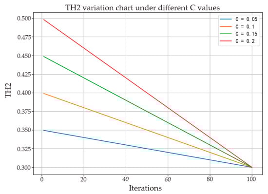 In the equation, represents the current iteration count, is the maximum iteration count, and is a constant dynamic development factor. varies according to the dynamic development factor, as illustrated in Figure 3, where is set to 100.