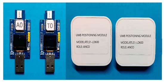 In this study, the HR-RTLS1 series ULM1 devices were used for measurements. The setup included base stations labeled with the prefix ‘A’ and tags labeled with the prefix ‘T’, as shown in Figure 5. ULM1 devices are low-cost hardware that integrate UWB transceivers and additional inertial sensors. These devices are popular in indoor positioning applications and can easily be interfaced with Arduino platforms or standalone computers for conducting wireless channel measurements.